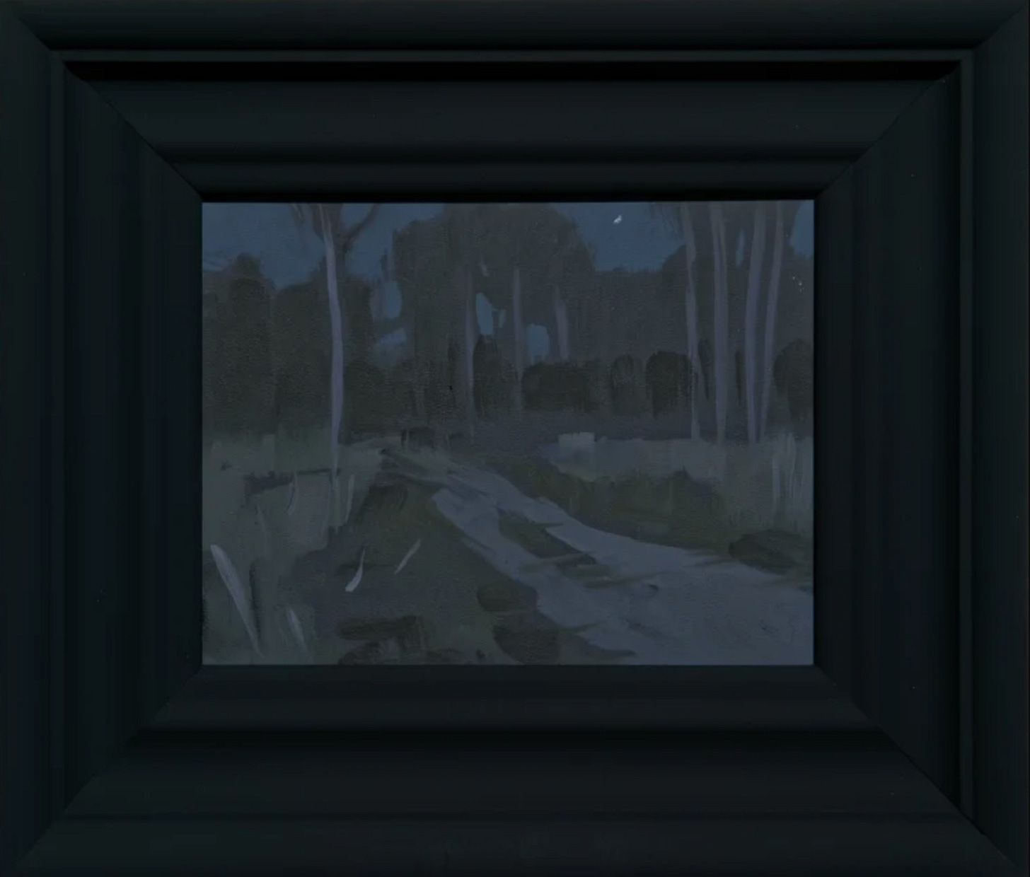 For his new exhibition, Sasaki spent 10 months painting en plein air—in the dark. Using a 3D-printed black paintbox of his own design (“the readymade ones were too beige,” he quips) and a palette limited to green, umber, navy, and grey, he worked outdoors through frostbite, mosquitoes, and the watchful eyes of coyotes and deer. Each of the 35 small panels captures the fragile half-hour of nautical twilight, when light dissolves, forms flatten, and the horizon disappears.
